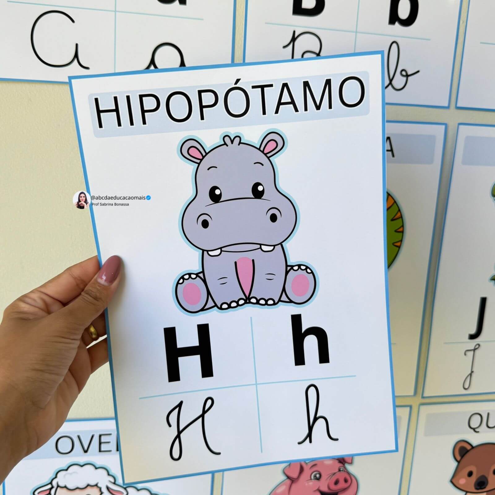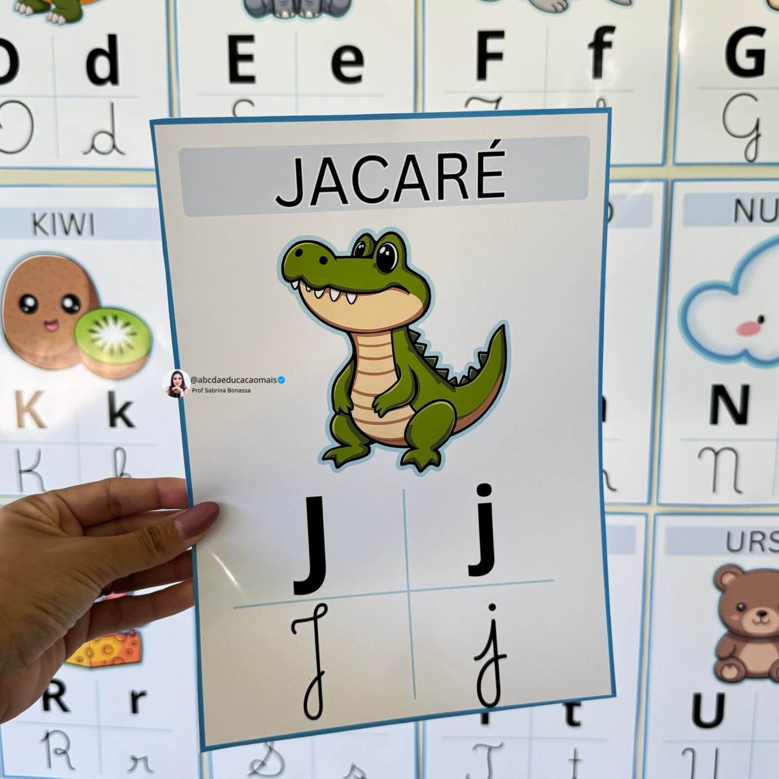 Letra maiúscula, minúscula e cursiva, facilitando o reconhecimento e a associação pelas crianças