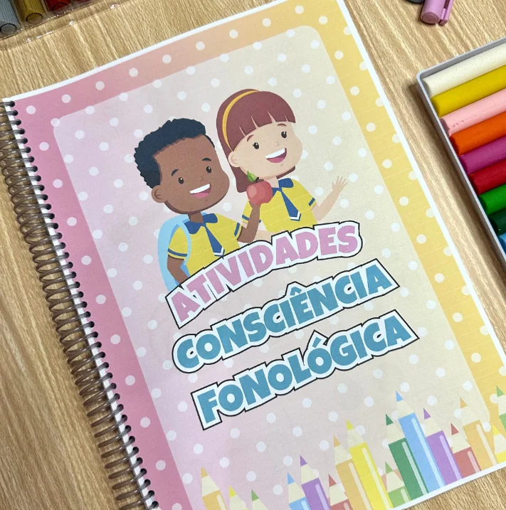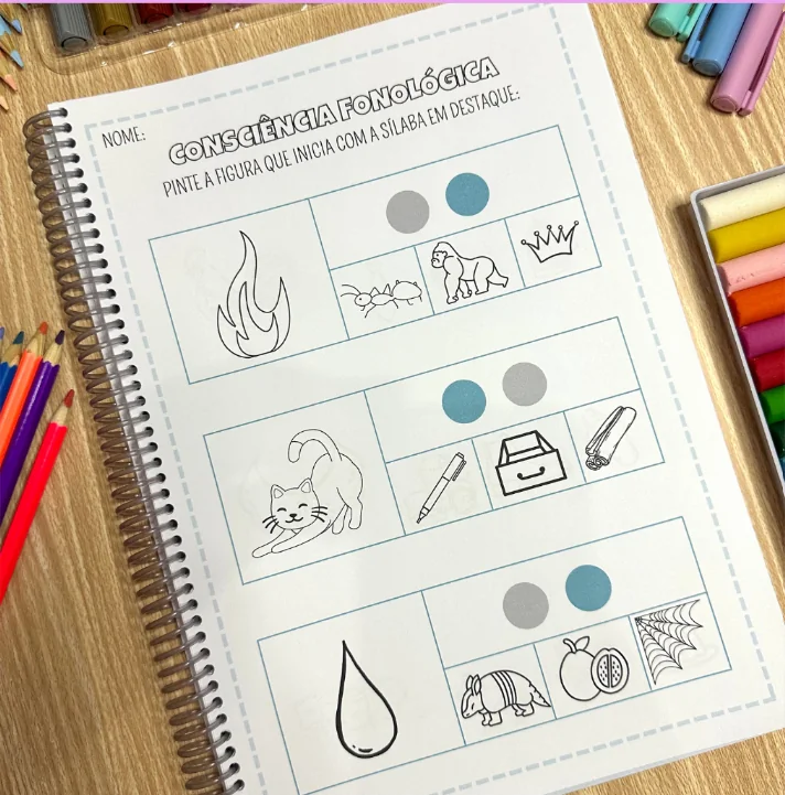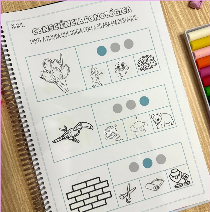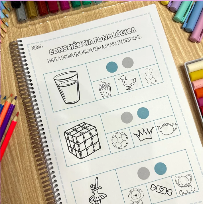 A apostila Consciência Fonológica possui 42 páginas de atividades para colorir, para crianças de 4 a 6 anos. Essa proposta desenvolve a consciência fonológica e estimula a percepção auditiva, habilidades necessárias para a alfabetização. Nessa apostila você encontra sugestões de atividades em que a criança deverá identificar qual sílaba da palavra a bolinha está representando, e pintar a figura que inicia com essa sílaba.