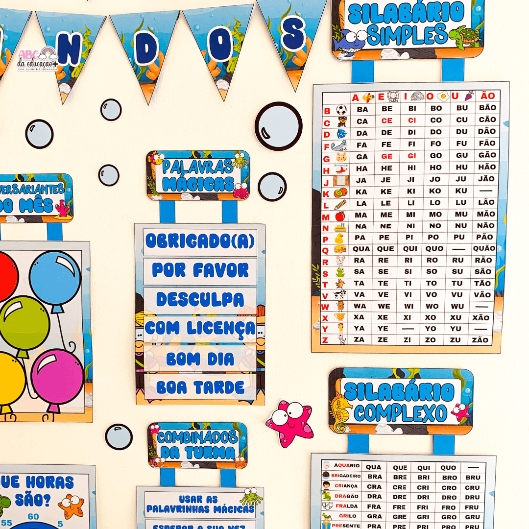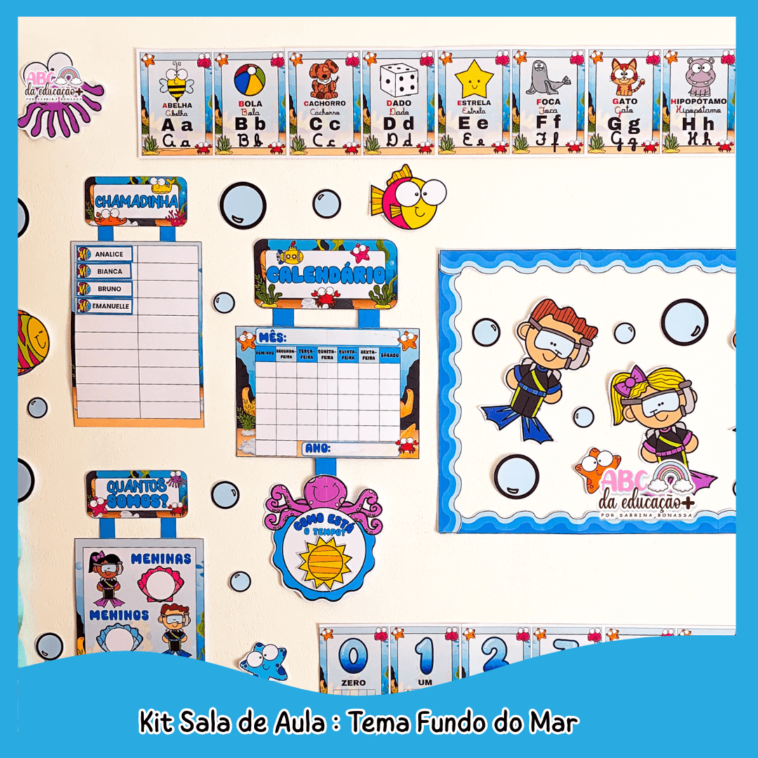 Deixe sua sala de aula ainda mais encantadora, organizada e pedagógica com o Kit Completo de Ornamentação de Sala – Tema Fundo do Mar.