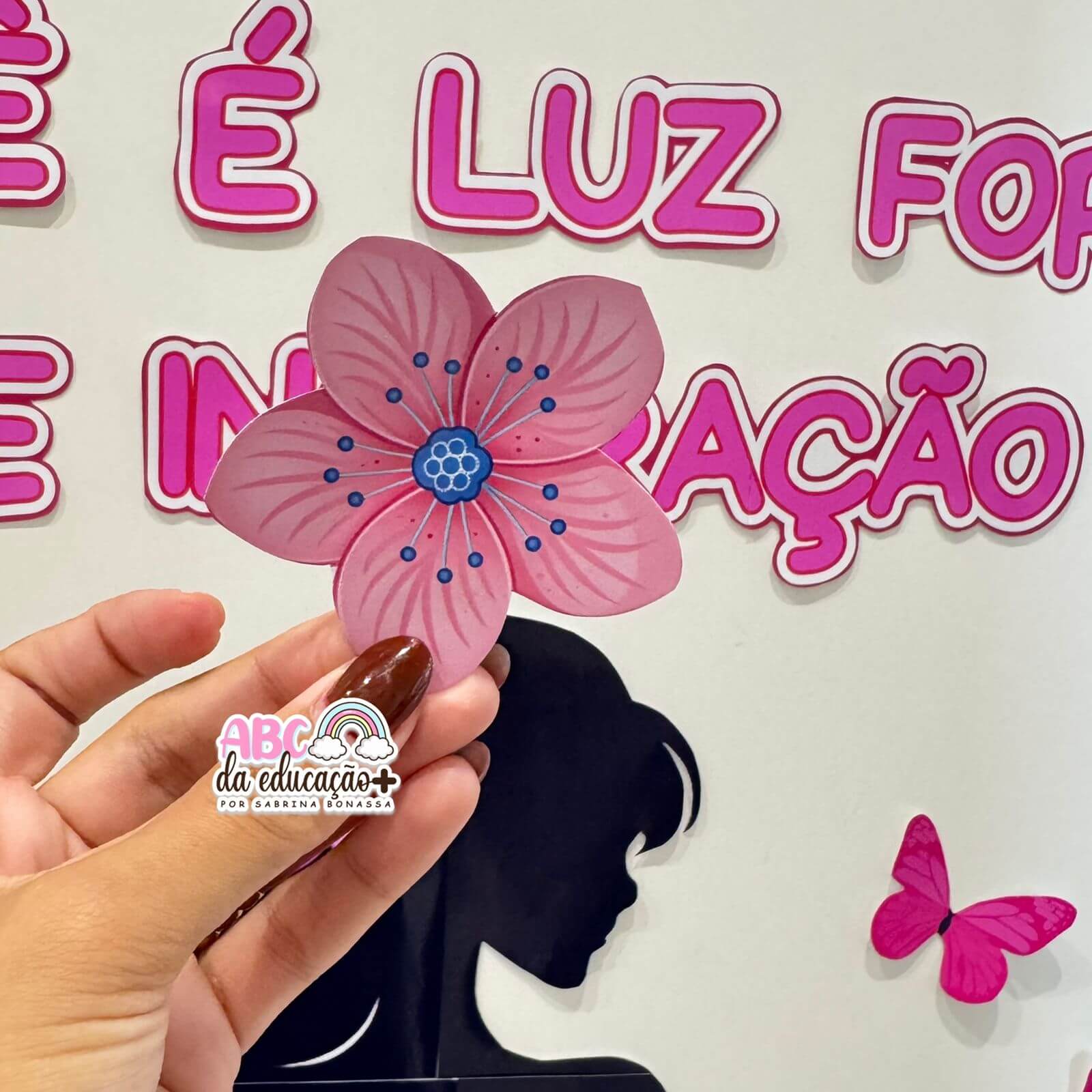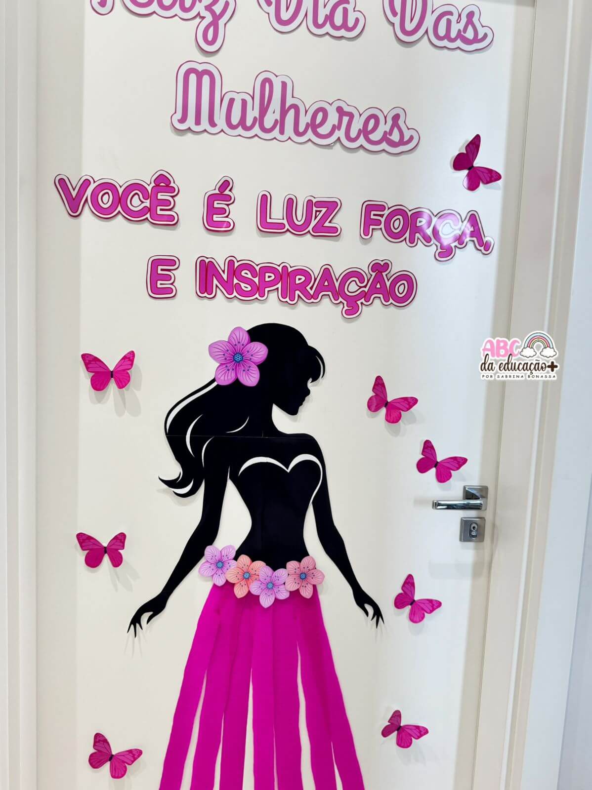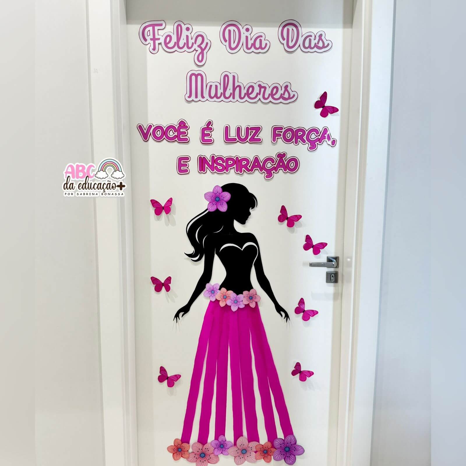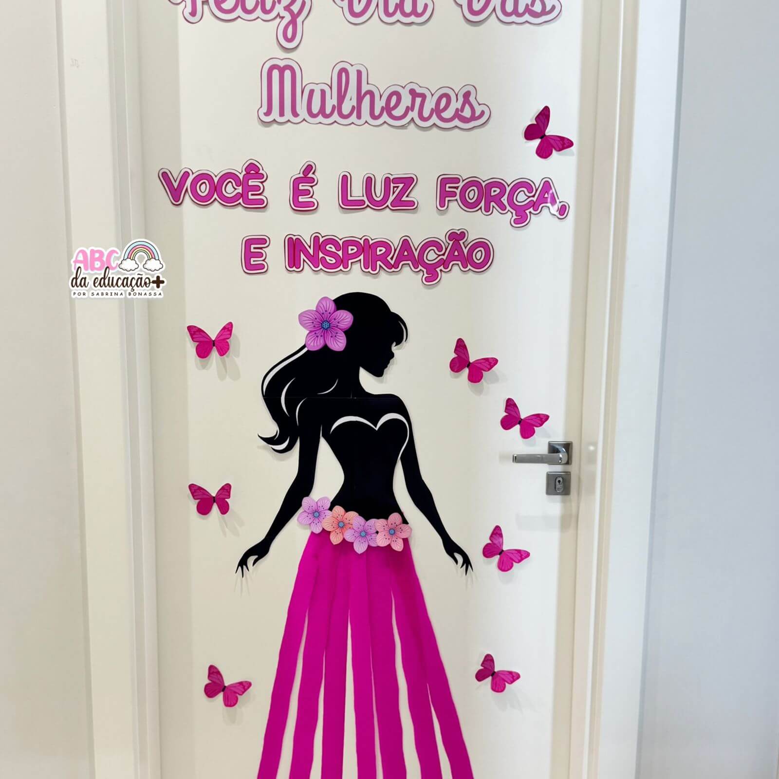 A composição conta com silhueta feminina, detalhes florais e borboletas em tons de rosa, criando um visual harmonioso e inspirador. Ideal para portas, murais, corredores ou espaços de acolhimento na escola. Usamos papel crepom rosa na parte da saia
