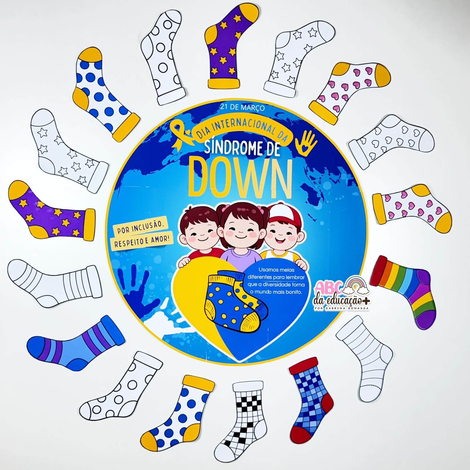 Este material foi desenvolvido para trabalhar a inclusão, o respeito e a valorização das diferenças no Dia Internacional da Síndrome de Down (21 de março). O painel traz o símbolo das meias diferentes, representando a diversidade e a importância de acolher cada pessoa como ela é.