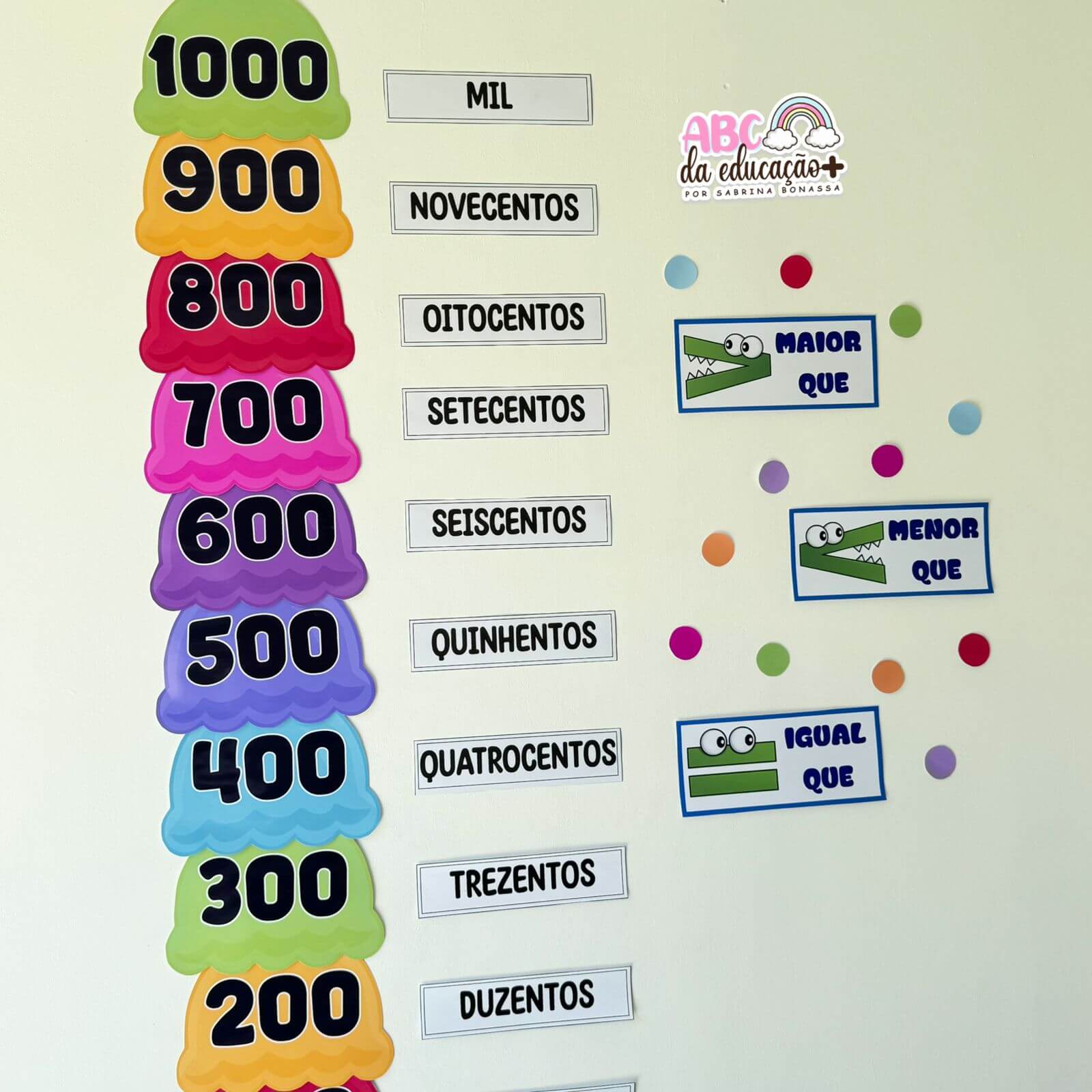 Com um design colorido em formato de sorvete empilhado, o painel apresenta os números de 100 a 1000, acompanhados de seus nomes por extenso, facilitando a associação entre número e escrita. Além disso, conta com os símbolos de maior que, menor que e igual, representados de forma divertida, auxiliando na compreensão visual dos conceitos matemáticos.